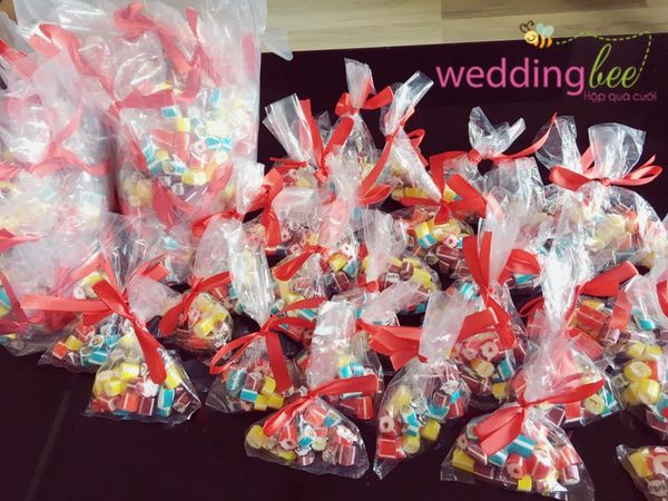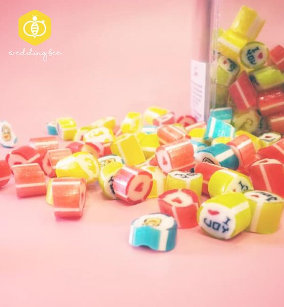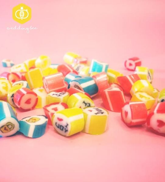 Với khách đặt từ 200 suất trở lên, bạn được chọn hình kẹo theo yêu cầu: chữ tên cô dâu chú rể/ ngày cưới hoặc thank you...